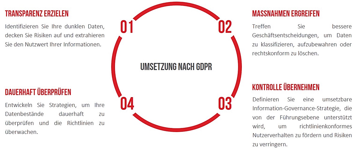 Für Unternehmen ist es umso wichtiger den Datenberg unter Kontrolle zu bringen. Der Datenberg und DarkData erhöhen das Risiko des Rechtsbruchs, da die Inhalte der Daten unbekannt sind. Dark Data kann unternehmenskritische aber auch personenbezogene Daten beinhalten.